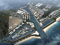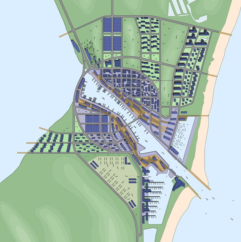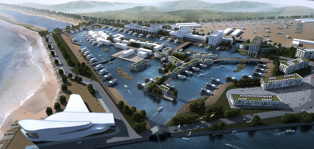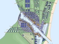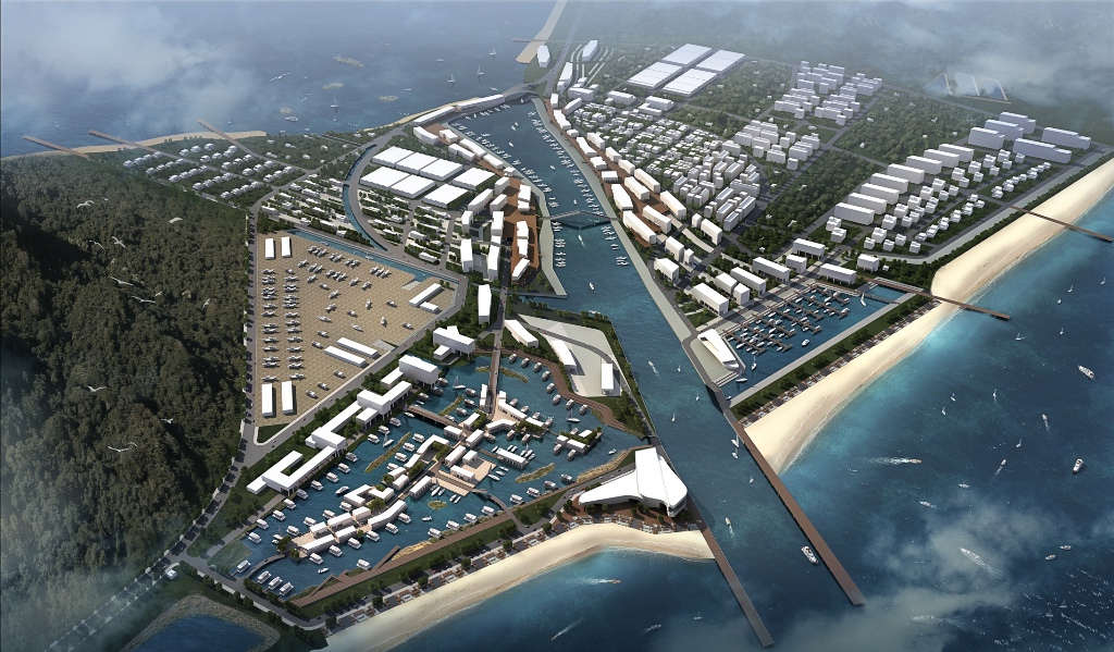 Beidaihe Eco City. Die Vision sieht vor, einen Industriefi schereihafen in ein ultramodernes nachhaltiges Stadtgefüge für 20.000 Einwohner umzuwandeln. Die Stadt soll als